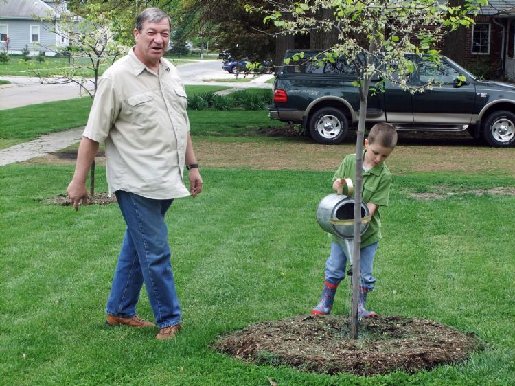 Victor helping PopPaw water one of the new white buds planted for Ronan & James Thomas.