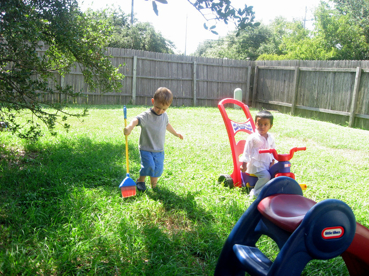 Taking a cue from NeNe, Victor tried to sweep the yard.